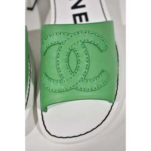 Chanel 22S Green Calfskin Leather White CC Logo Mules Slide Sandal Heel Flat 37