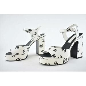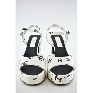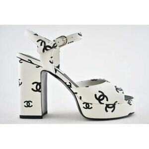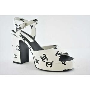 Chanel 22S White Black Lambskin CC Logo Platform Strap Block Heel Sandal 36.5