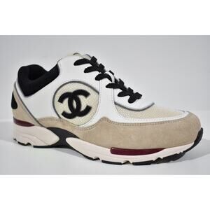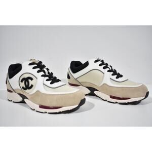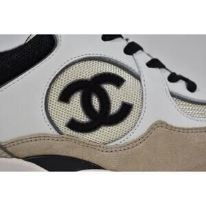 Chanel 22S White Ivory Beige Black CC Logo Tie Flat Runner Trainer Sneaker 41.5
