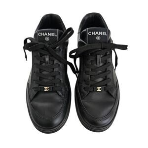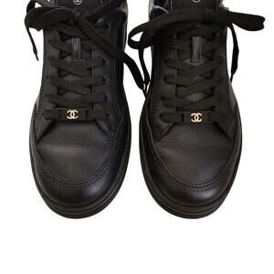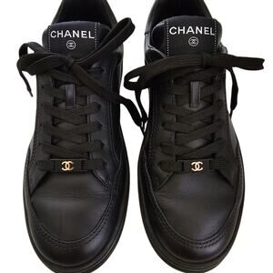 Chanel 23A CC Logo Calfskin Sneakers Size 38 US 7 7.5 Black Leather Gold Lace Up