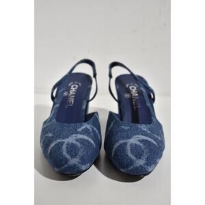 Chanel 23B Coco Sling Dark Blue Denim White CC Logo Slingback Block Heel 39