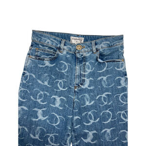 Chanel 23B Runway Light Blue Denim White CC Printed Logo Sequin Skinny Jeans 36