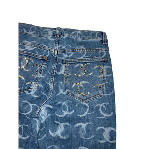 Chanel 23B Runway Light Blue Denim White CC Printed Logo Sequin Skinny Jeans 38