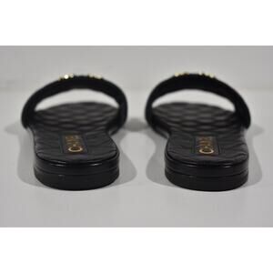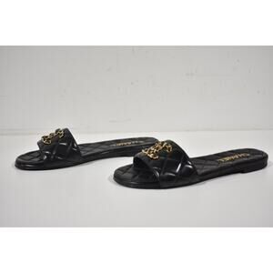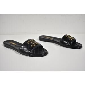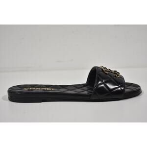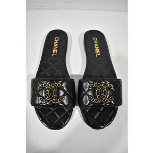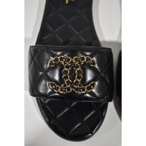 Chanel 23P Black Chain Gold CC Logo Quilted Mules Slide Sandal Slip On Flat 38