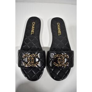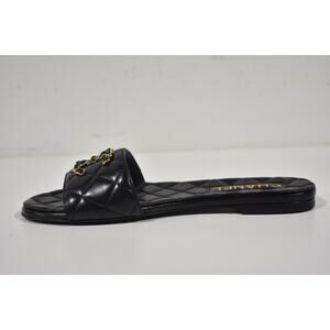 Chanel 23P Black Chain Gold CC Logo Quilted Mules Slide Sandal Slip On Flat 38.5