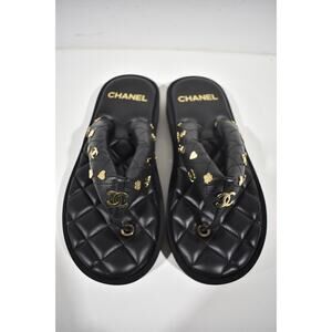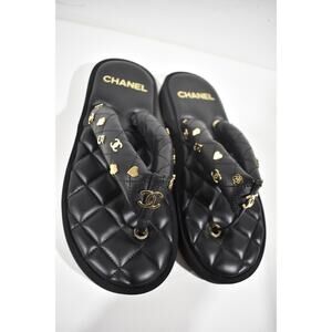 Chanel 23P Black Quilted Charms Padded Pool Thong Logo Slide Flat Sandal 40.5