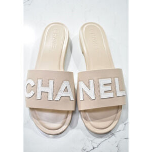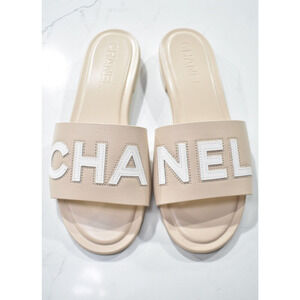 Chanel 23P Ivory White Leather CC Logo Letter Mules Slide Slip Sandal Flat 38