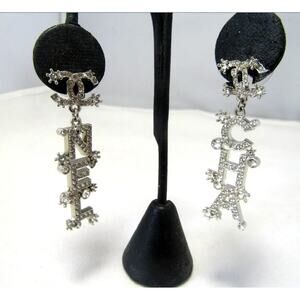 Authentic Chanel 23P Pendant Silver Crystal CC Logo Letter Dangle Drop Earrings