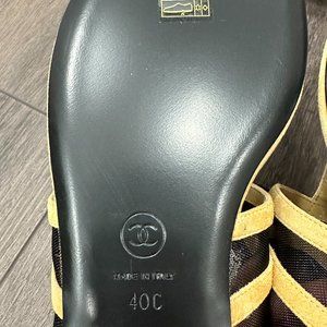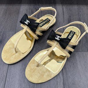 Chanel 24 Caramel Camel Brown Beige CC BLACK BOW LOGO Gold Sandals SIZE 40.
