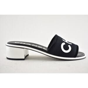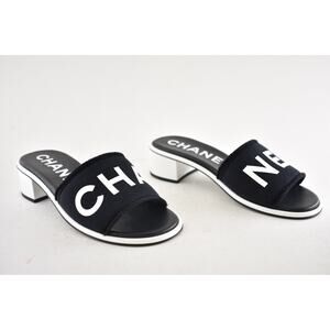 Chanel 24C Black White CHA NEL Letter Logo Mule Slide Block Heel Sandal 37.5