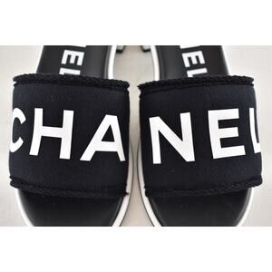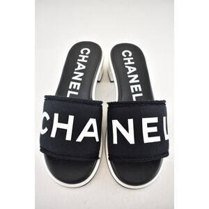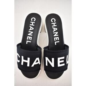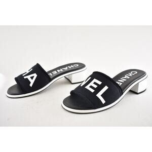 Chanel 24C Black White CHA NEL Letter Logo Mule Slide Block Heel Sandal 39.5
