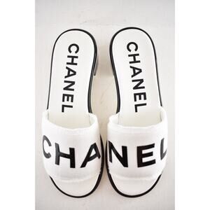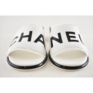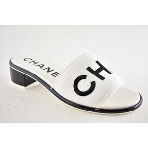 Chanel 24C White Black CHA NEL Letter Logo Mule Slide Block Heel Sandal 38