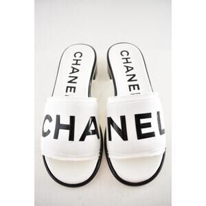 Chanel 24C White Black CHA NEL Letter Logo Mule Slide Block Heel Sandal 40