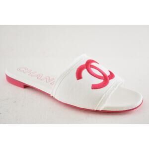 Chanel 24C White Fuchsia Pink CC Logo Fabric Knit Mule Slide Slip On Sandal 39