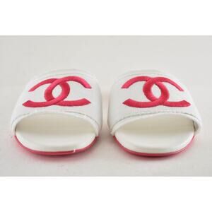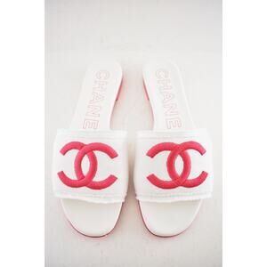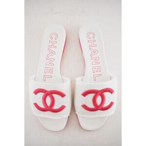 Chanel 24C White Fuchsia Pink CC Logo Fabric Knit Mule Slide Slip On Sandal 41