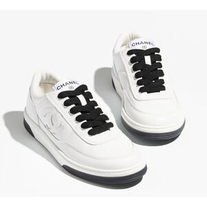 Chanel 24P White Black Leather CC Logo Flat Lace Up Runner Trainer Sneaker 42