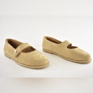 Chanel 25B Beige Suede Shearling Fur Mary Jane Moccasin Ballet Loafer Flat 38