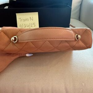 Bag is microchip; comes with chain, dust bag, box, camellia flower, and ribbon.