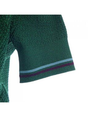 This is an authentic Chanel P75440 K10809 Knitwear in a vibrant green hue. The sweater features a ribbed neckline, cuffs and hem, accented with contrasting navy and pink stripes for a classic Chanel look.