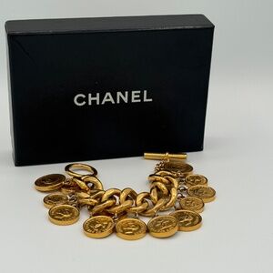 The Chanel 70s Gold Coin Dangle Bracelet is a stylish and luxurious accessory that exudes elegance and glamour. Made by the prestigious brand Chanel, this bracelet features a gold color and a chain style design with dangling coins. It adds a touch of sophistication to any outfit, making it a perfect statement piece for those who appreciate high-end fashion jewelry. Ideal for both casual and formal occasions, this bracelet is a must-have for any fashion-forward individual looking to add a touch of Chanel allure to their ensemble. Comes with COA. This bracelet is a rare find and sells for upwards of $5,000.