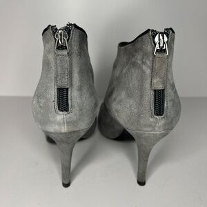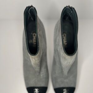 These chic Chanel Grey/Black suede cap toe ankle boots have the intricate detailing that we love from Chanel. Grey suede combined with a black suede cap toe to add an element of classic Chanel sophistication. While the shapely heel and platform make these fierce ankle boots perfect for any fashionista. The boots feature a back zip, padded leather insole, and a leather sole. The boots have not been previously worn but show signs of wear due to improper storage. The right shoe has a sticky stain on the inner foot side and a small tear in the suede at the heel.The suede on the left shoe just above the heel is slightly worn giving a darkened hue. Location box 62