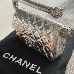 Add a touch of elegance to your evening with the Chanel Around The World Evening Bag/Clutch. This pre-owned beauty is made of quilted leather in metallic silver, with a classy silver metal strap for easy carrying. The bag measures 7.87 inches in width, 5.11 inches in height, and 1.96 inches in depth.