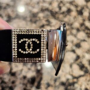 Chanel Swarovski CC logo black sunglasses. Serial number is etched in the glass, nose grips have CC logo. Comes with original leather authentic sunglass case and I have a Chanel box in which to place the case and glasses. Only callout is about 2 rhinestones missing from one side of the CC logo but is not noticeable. Gorgeous one of a kind pair with the class and beauty of a Chanel.