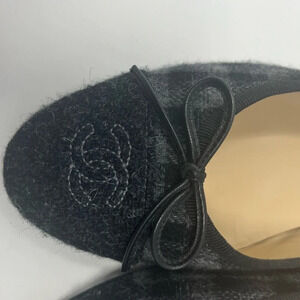 Chanel Ballet Cap toe Black Grey Plaid tweed textured flat size 37