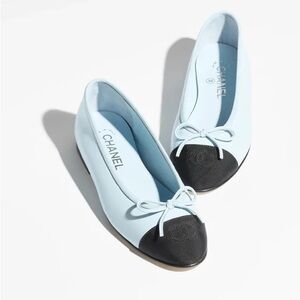 The ballet flat that started a movement đ. These Chanel two-tone ballet flats are the definition of timeless chicâParisian polish with everyday ease. Featuring supple light blue leather, a contrasting black cap toe, and a sweet bow detail, theyâre perfect for work, travel, or elevating your favorite jeans.