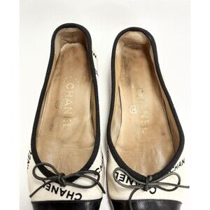 Chanel Ballet Flats White & Black Leather & Canvas Monogram Logo Y2K Sz 35