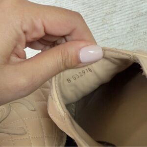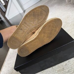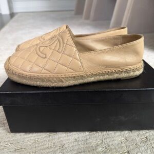 Authentic Chanel Beige Quilted Lambskin Leather CC Women's Espadrilles Size EU 38 used twice. They are slightly loose on me, and I'd rather have something more fitting. They are in great condition. Stylish CHANEL espadrilles in beige. Features quilted pattern and signature logo. Ideal for chic comfort.
