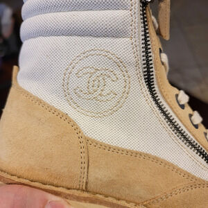 chanel combat boots cc logo beige suede canvas lace up designer womens luxury streetwear