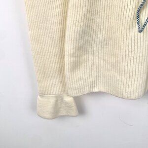 Beige wool high-neck long-sleeve knit sweater with camellia logo embroidery and drawstring