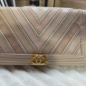A stunning Authentic Pre-owned Preloved Chanel Chevron Bi-Fold Boy Wallet. I used an unbranded chain in gold and pink to carry as a crossbody. I can include the chain if requested.