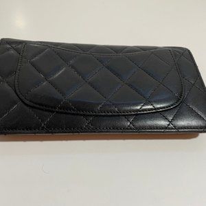 Chanel Bi-Fold wallet in Black Lambskin leather with CC logo matelasse gently used overall good pre-owned condition light signs of use. no card no box.