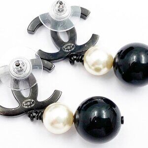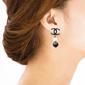 Chanel Black CC Pearl Black Bead Dangle Piercing Earrings