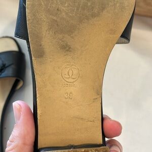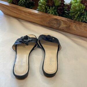 Chanel Black Camellia Embellished Leather Slide sandal shoes Size 39
