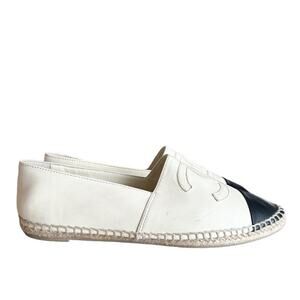 Chanel Black Cap Toe White Leather CC Logo Espadrille Flats 40