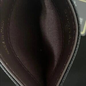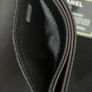 Chanel card holder in black textured leather. Features iconic gold logo. Compact and chic design