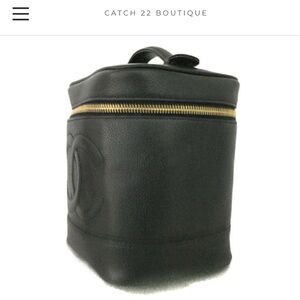 This is a classic CHANEL black CC logo caviar leather tall cosmetics vanity top-handle vintage hand bag. It features gold-tone hardware, a CC logo zipper pull, and 1 interior pocket. We have added a non-branded gold-tone & leather removable strap to the handle.