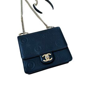 Chanel black mini square bag. Collectible "COCO" embossed smooth leather. Brushed gold-tone hardware and chain strap with leather shoulder piece. One slip pocket at back. One interior slip pocket.