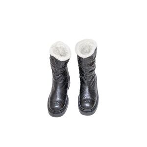 Chanel Black Crackled Patent Leather Shearling-Lined Winter Boots – Size 36.5 C