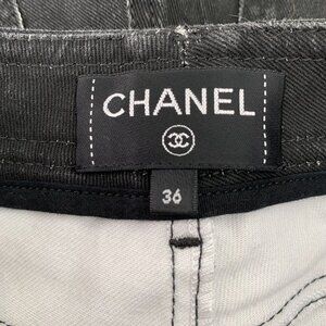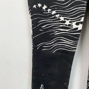 These black denim jeans feature intricate white graphic designs, offering a bold and artistic aesthetic. The button includes Chanel branding for a luxurious touch.