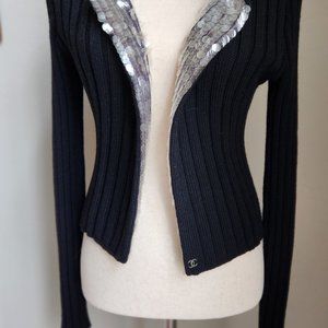 Perfect for the Holidays.. Stunning Chanel evening sweater, open cardigan style. No closure. Ribbed wool/silk blend. Super soft. A wide strip of silver paillettes runs down the inside of both front panels and are exposed when lapels are folded back. Beautiful one-of-a-kind statement piece. Like new. No missing paillettes. Made in Italy. Size is Italian 40 or US Small 4-6.