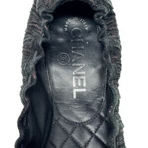 These are a beautiful and hard-to-find pair of Chanel ballet flats in black tweed with subtle pink glitter woven through. The CC logo is set on the side in black enamel for a discreet but unmistakable touch.