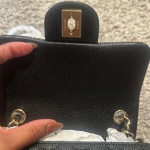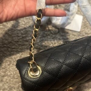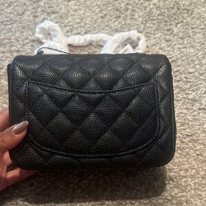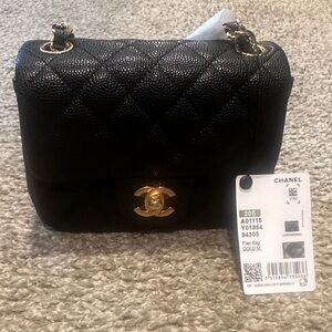 Chanel Caviar Quilted Mini Square Flap in Black. This shoulder bag is crafted of luxurious diamond quilted caviar leather in black. The bag features leather threaded gold chain-link shoulder strap and a gold CC turn lock. The flap opens to an interior of black leather with zipper and patch pockets. The quality is top notch!
