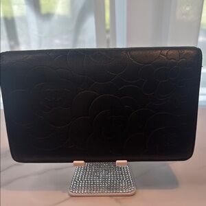 Sleek black wallet with embossed floral pattern. Features Chanel logo. Hologram intact. Clean interior
