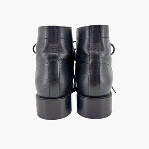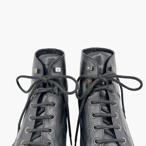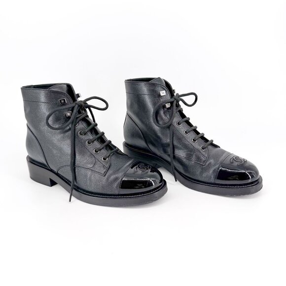 These Chanel combat boots feature subtly iridescent black leather uppers with patent leather CC cap toes, lace-up styling, and low block heels. Designed with leather lining and leather outsoles, they’re ideal for fall outfits, edgy casual looks, and cold-weather styling.