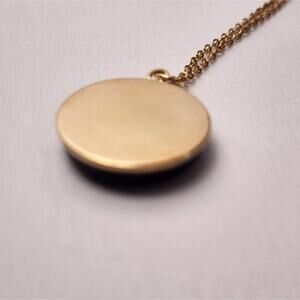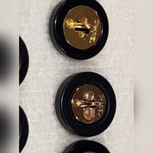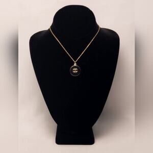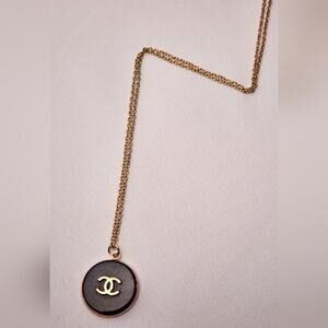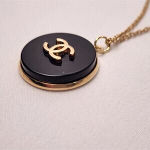 Authentic Chanel button on a sterling chain as to make a beautiful pendant necklace. The back has been removed and placed in a gold tone cabochon to make a beautiful necklace! The chain is 18" adjustable stainless. Pictures shown for reference to show the actual button before removing the backing. Fabulous classic black button with gold inlay CC converted to a wonderful charm.