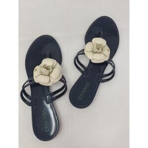 These Chanel Black Jelly Camellia Interlocking CC Thong Sandals in size 40 EU are a must-have. Made with rubber and featuring the iconic CC logo and Camellia accent, they add a touch of elegance and sophistication to any outfit. Complete with a dust bag and measuring at 0.5" heels, these designer sandals are in very good condition.